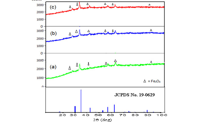 Figure 3.The XRD pattern of as-synthesized magnetite at 210oC for 3.5h (a), 5h (b), and 12 h(c)