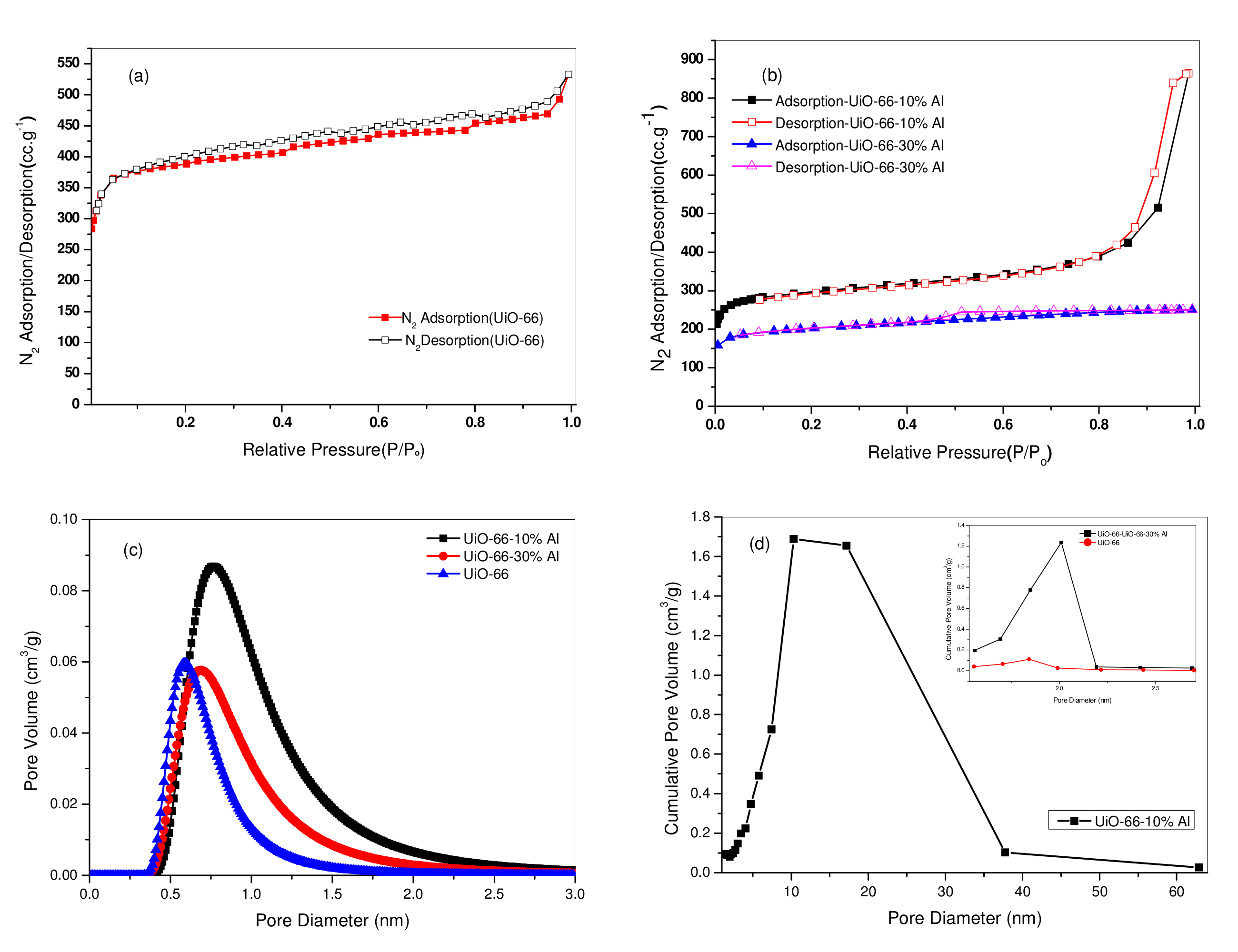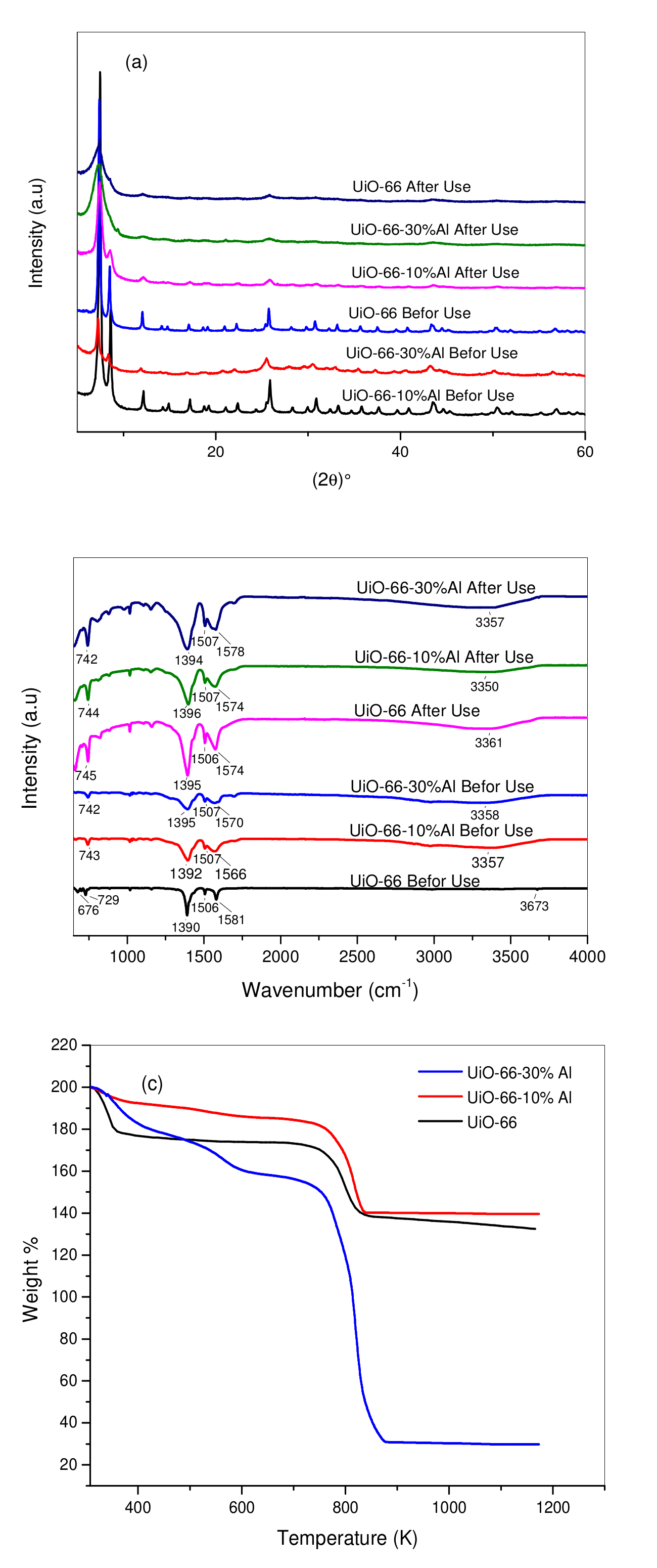 All chemicals were supplied by Sigma-Aldrich (Australia) without further purifications. A scaled-up procedure of a previously reported method [56] of synthesising Zr-MOF was successfully undertaken, using a modified ratio of ZrCl4:BDC:DMF (2.27 mmol ZrCl4, 2.27 mmol 1,4-benzenedicarboxylic acid [BDC]). The abovementioned chemicals were mixed with continuous agitation with 405.38 mmol N, N-dimethylformamide (DMF) solvothermally. The resulting mixture was placed in an autoclave at 393 K for 1 d. The product Zr-MOF was filtered, dried and immersed in chloroform for 5 d. After activation by chloroform was completed, the solid was filtered and dried using vacuum and heated at 463 K for 48 h. The following method was used to synthesise UiO-66-10%Al. Terephthalic acid 1.1 g, 98%; Sigma-Aldrich) and DMF (73 mL, 99%; Sigma-Aldrich) were mixed together and stirred until the acid dissolved. Within 10 min of the clear solution forming, ZrCl4 (1.5 g; Sigma-Aldrich, 99%) was added to the solution with continued stirring for another 5 min. Al (NO3)3.9H2O (0.15 g) was then added, along with 2 mL of H2O, to the mixture and stirred for another 15 min. The solution was transferred to a 125-mL Teflon-lined autoclave, which was tightly sealed and then placed in a preheated oven at 132 °C for 24h. The white powder product of UiO-66-10% Al was collected using a centrifuge machine and washed in DMF three times. The resultant product was dried in an oven and activated by immersing it in absolute methanol (100%; Sigma-Aldrich) for 5 d. Before using the MOF as an adsorbent, it was filtered, dried and heated in vacuum at 473K overnight. To synthesise UiO-66-30%Al, ZrCl4 (1.5 g) was mixed with terephthalic acid (1.3 g) in DMF (60.2 mL). After mixing for 15 min, Al (NO3)3.9H2O (0.45 g) was added and then 5 mL of H2O was added to the mixture. The solution was mixed for approximately 30 min. It was then moved to a 125-mL Teflon-lined autoclave, which was tightly sealed and then placed in a preheated oven at 157°C for 1d. The white powder product of UiO-66-10% Al was collected using a centrifuge machine and washed in DMF three times. The resultant product was dried in an oven and activated by immersing in absolute methanol (100%; Sigma-Aldrich) for 5d. Before using the MOF as an adsorbent, it was filtered, dried and heated in a vacuum at 473K overnight.