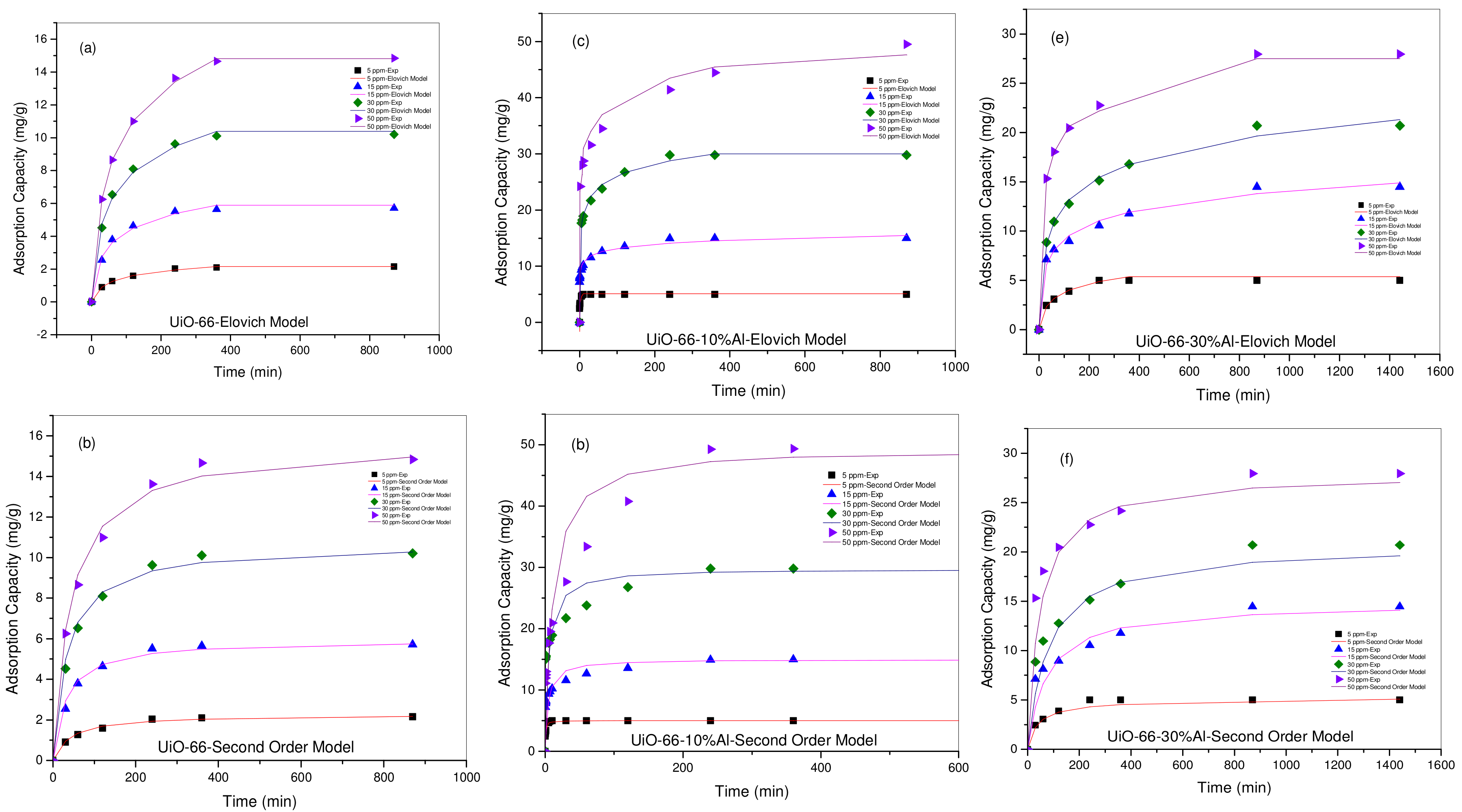 The amount of MB adsorbed onto UiO-66, UiO-66-10%Al and UiO-66-30%Al MOFs at any time was calculated using Equation 1 [118]. However, the percentage removal of MB was computed by Equation 2 [119].