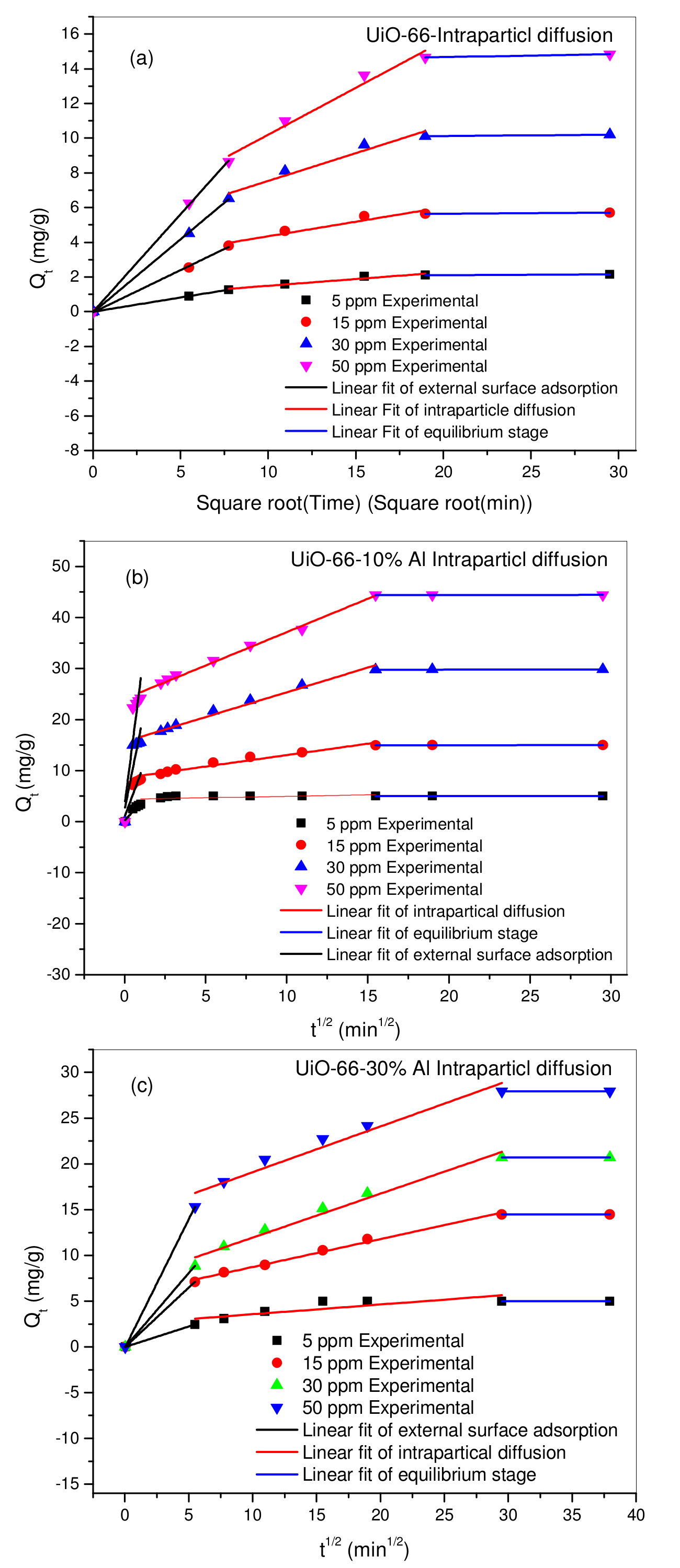 The intraparticle diffusion–based model is commonly used to test the mechanism of adsorption of pollutants onto a sorbent. This model is employed to identify the adsorption mechanism of MB onto MOF, and can be written as follows: