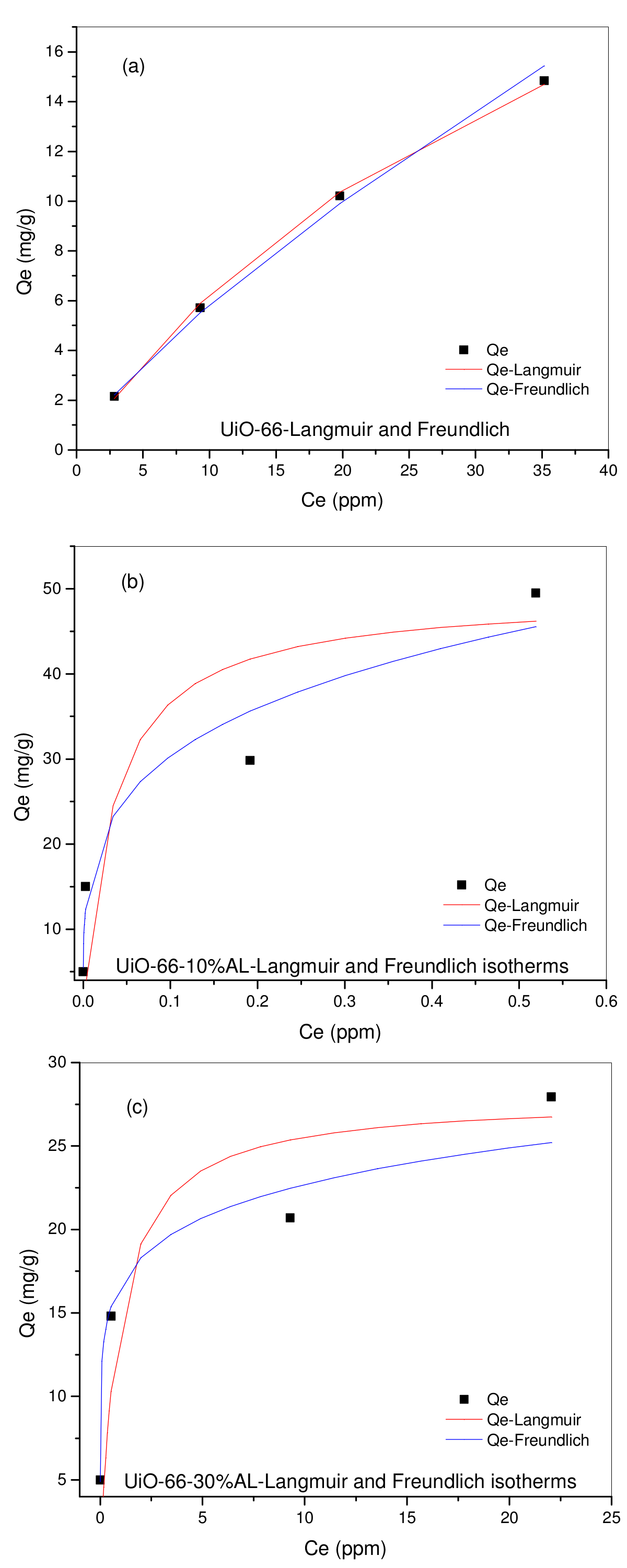 Equilibrium studies were also performed in the same experiments carried out for kinetics studies. Agitation was done using a magnetic stirrer machine at 200 rpm until the process reached equilibrium. The amount of MB adsorbed onto UiO-66, UiO-66-10%Al and UiO-66-30%Al MOFs at equilibrium can be expressed by Equation (2)[123]: