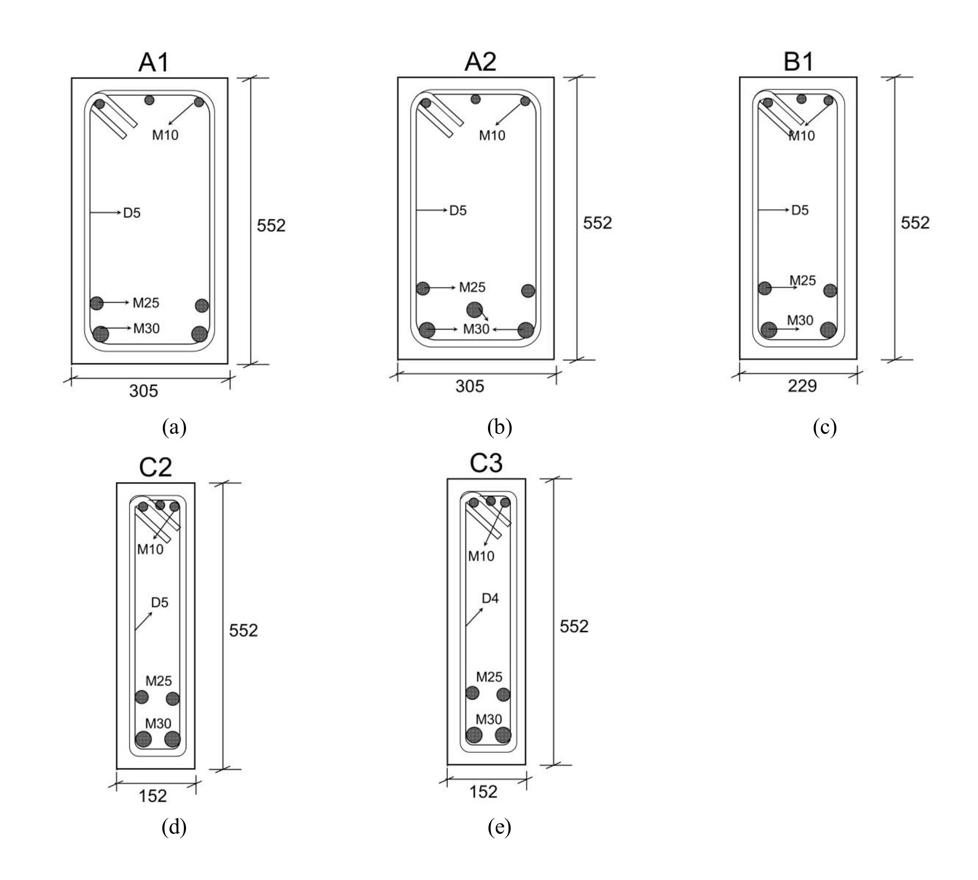 Figure 1.Figure 1. Details of reinforcement of Toronto beams [11], units in mm : (a) Beam A1, (b) Beam A2, (c) Beam B1, (d) Beam C2, and (e) Beam C3