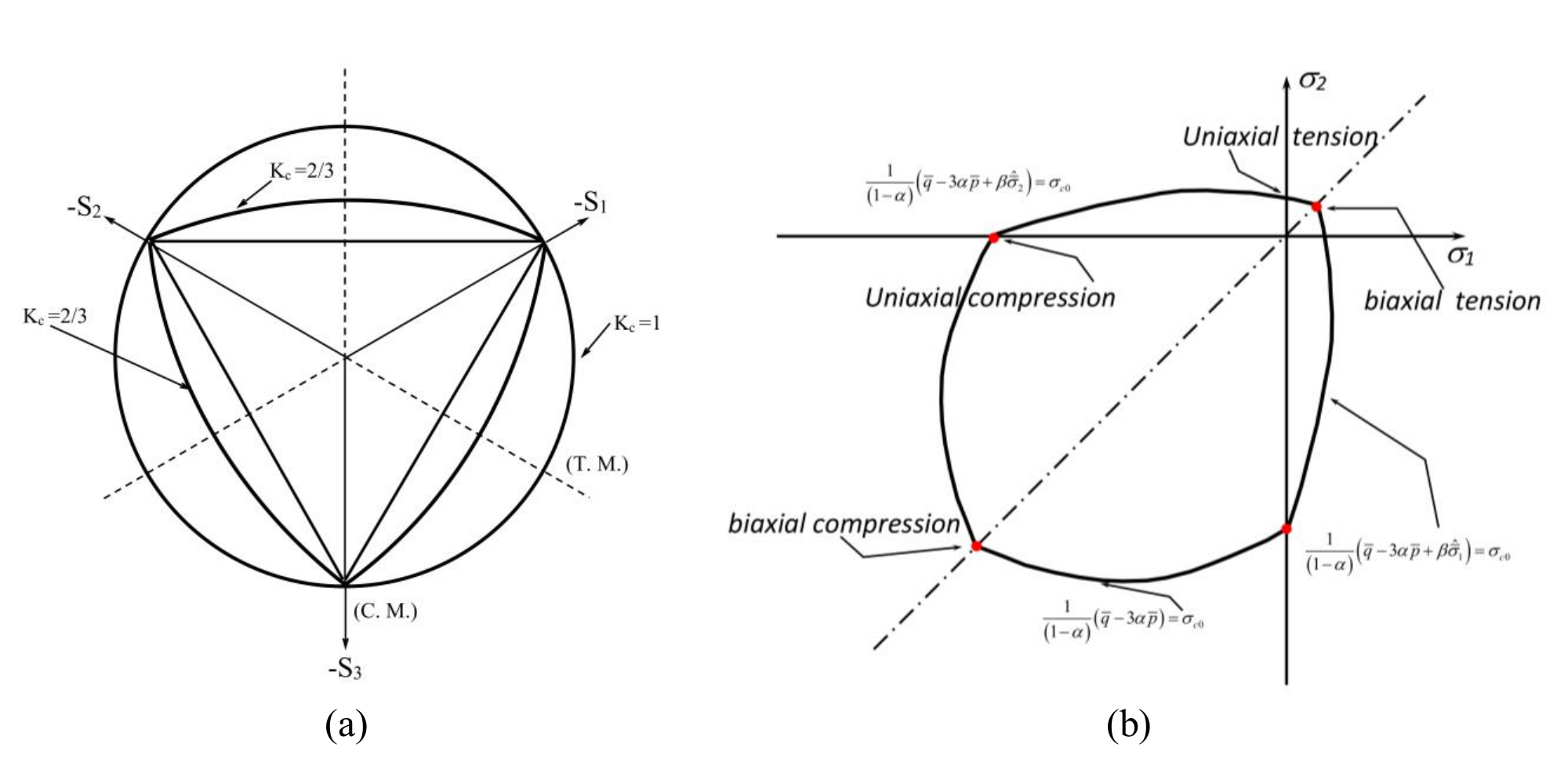 \( K_{c} \) in Figure 4a denotes the failure surface in the deviatoric plane. The default value of \( K_{c} \) in ABAQUS is 2/3, but in general, the \( K_{c} \) lies in the range between 0.5 and 1.0.