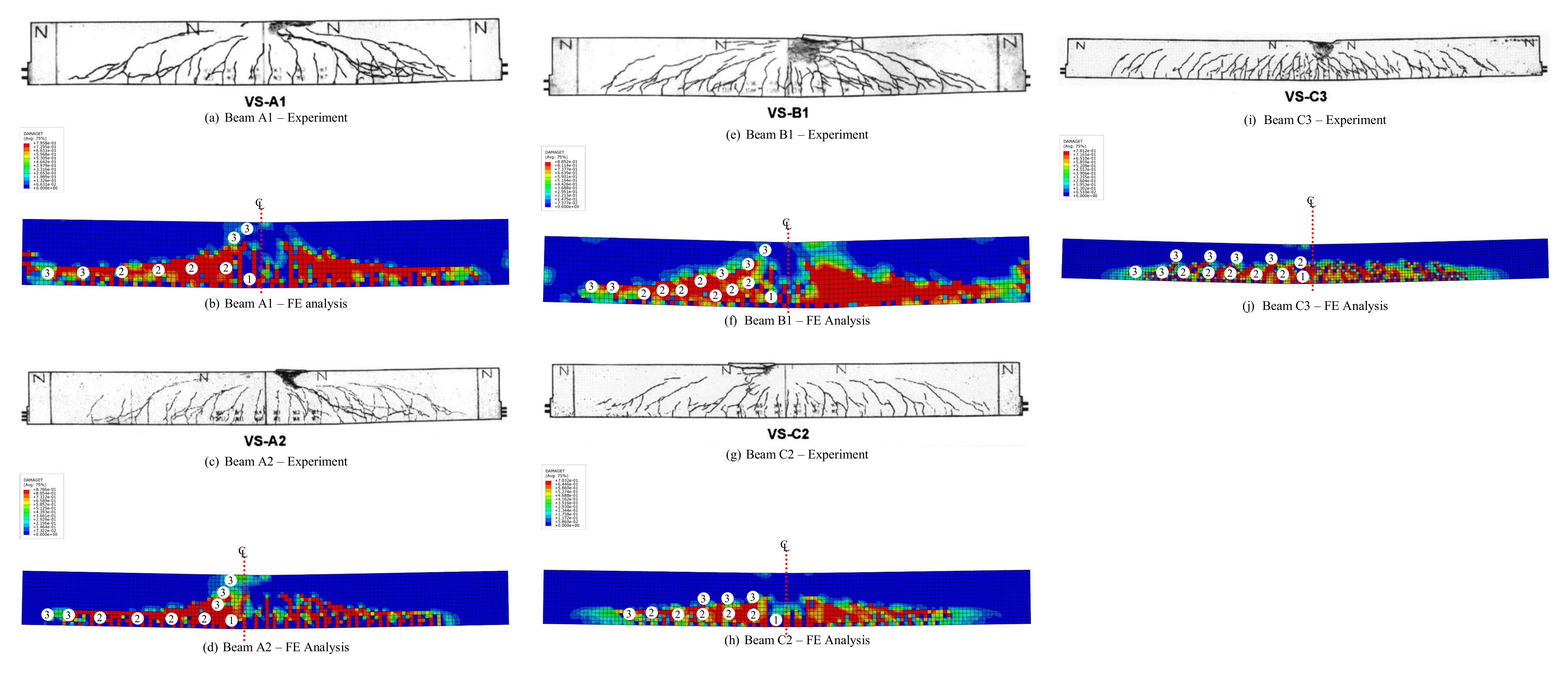 Figure 5 (a), (c), (e), (g) and (i) indicate the crack propagation in the experiment [11]. In general, flexural cracks initiated followed by the appearance of the diagonal cracks in the middle third of the beam depth in the shear span. With the increased loading, diagonal cracks extended in the upward and downward directions. Under the case of the beam with intermediate loading span and web reinforcement, the specimens failed in shear. The failure occurred due to the splitting of the concrete in the compression zone.