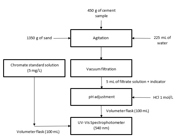 The quantification of chromium hexavalent was carried out by colorimetric technic (spectrophotometric). Metrohm UV-Vis Spectrophotometer - 662 photometer was used to determine the chromium final concentrations, which were expressed in mg kg-1. All tests were done by using the procedures determined by European Standard EN196-10/2006 and performed in triplicate. The summary of the experimental procedure is shown in Figure 1.
