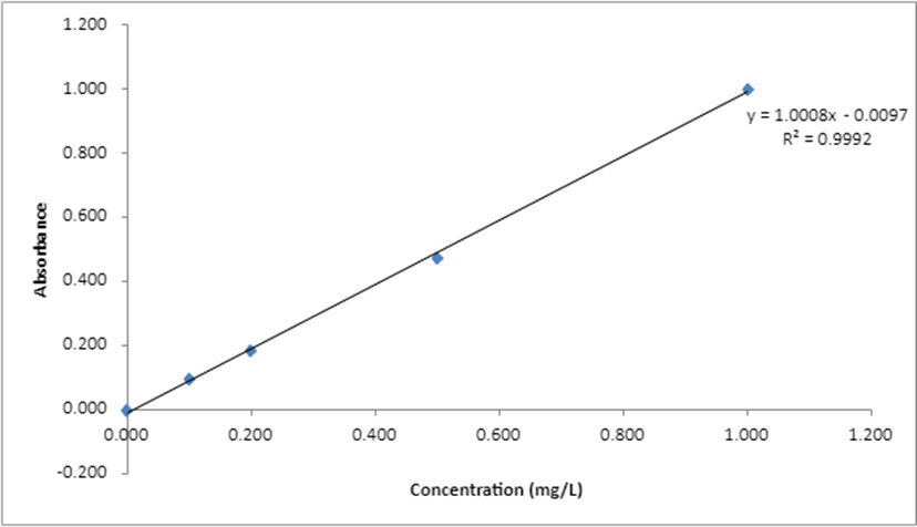 Standard curve data such as the absorbances measurements and their respective concentrations are shown in Table 1. The standard curve is shown in Figure 2. Equation (5) shows the equation of the line obtained by the linearity of the standard curve.