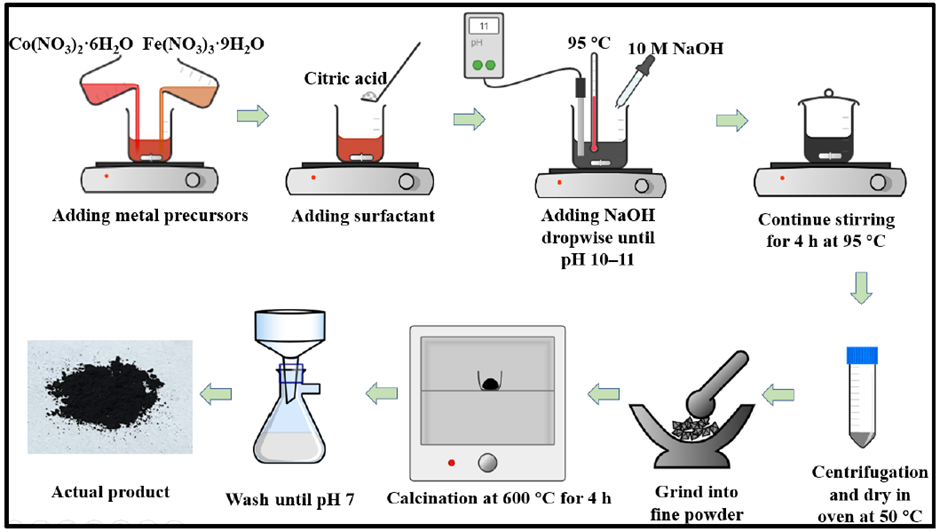 The CoFe2O4 catalyst was synthesized through a simple co–precipitation method. Firstly, 5 mmol of Co(NO3)2·6H2O and 10 mmol of Fe(NO3)3·9H2O as the metal precursors were added into 50 mL of DI water. Then, 30 mmol of C6H8O7 was added to the mixture as a surfactant to promote the consistency of precipitate formation along with preventing agglomeration. The mixture was heated to 95 °C and 10 M NaOH was added dropwise while stirring vigorously until the pH was adjusted to 10–11. Next, the solution was allowed to stir for 4 h at the same temperature. After cooling the resultant solution, the black precipitate was isolated from the solution by centrifugation and dried in oven at 50 °C for 48 h. Then, the product was grinded into powder using a pestle and mortar until. Thereafter, the resultant product was open–air calcined at 600 °C in a furnace for 4 h to promote crystallinity and to remove the C6H8O7 surfactant. Finally, the catalyst was washed with distilled water until pH 7 followed by drying. For the performance comparison, four other catalysts, namely CoFe2O4/xFe2O3 (abbreviated by CoFe–x) where x = 0.25, 0.50, 0.75 and 1.00, were prepared similarly. The molar ratio of Co(NO3)2·6H2O:Fe(NO3)3·9H2O:C6H8O7 was increased from 1:2:6 to 1:2.5:7, 1:3:8, 1:3.5:9 and 1:4:10, respectively. The synthesis method is illustrated in Figure 1.