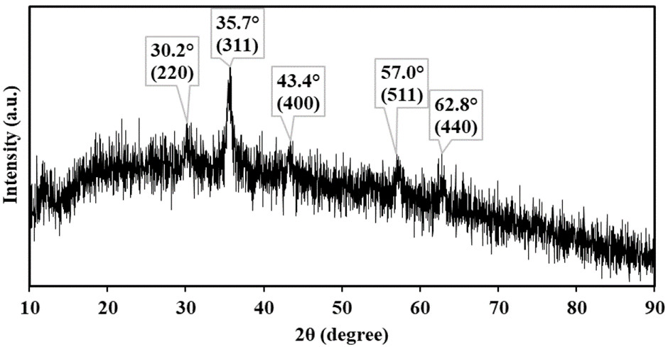 The crystal structure of CoFe2O4 was investigated using XRD (Figure 3). Several diffraction peaks were observed at 2θ = 30.2°, 35.7°, 43.4°, 57.0° and 62.8°, which were assigned to (220), (311), (400), (511) and (440) crystal planes of the spinel CoFe2O4 respectively (JCPDS No. 22–1086) [19,20]. The results indicated that CoFe2O4 nanocomposite has been successfully obtained. The intensity of diffraction peaks were less distinctive compared to the reported XRD patterns by [21,22], suggesting that the formation of CoFe2O4 had a low crystallinity. However, the catalysts with more complete crystallinity were claimed to show a weaker catalytic activity [23] . In addition, it has ben reported that the concentration of defect was usually higher in the amorphous phase, resulting in greater conductivity and better catalytic performance [24]. Thus, the mostly amorphous structure of the CoFe2O4 could be effective in the pollutant removal.