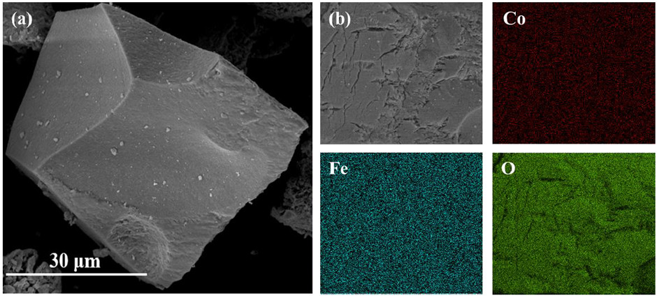 The FESEM micrograph revealed the cubic morphology of CoFe2O4 catalyst as shown (Figure 4 a ). The EDX elemental mapping (Figure 4 b ) illustrated that both the Co and Fe were homogeneously distributed on the catalyst surface with the ratio of Co:Fe at 1:1.7, which was close to the theoretical molar ratio of 1:2 during the synthesis process. These findings confirmed the formation of CoFe2O4 during via the co–precipitation method. In addition, magnetic property could be observed from the CoFe2O4 catalyst by using an external magnet, confirming the formation of spinel ferrite.