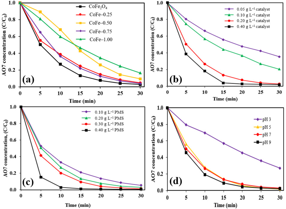 The performance comparison of CoFe2O4 and CoFe–x (x = 0.25, 0.50, 0.75 and 1.0) for the AO7 degradation via PMS activation is illustrated in Figure 5 a whereas the removal efficiencies and pseudo–first order rate constant (k) of the mentioned catalysts are presented in Table 1 . The pseudo–first order kinetic is equated as: