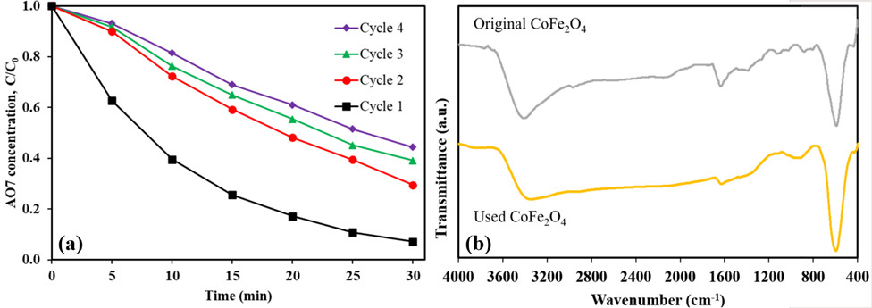 Figure 7.Figure 7. (a) Reusability of CoFe2O4 catalyst (Conditions: pH = 7, [CoFe2O4] = 0.20 g L−1, [PMS] = 0.20 g L−1, [AO7] = 10 mg L−1). (b) FTIR spectra of the CoFe2O4 catalyst before and after use.