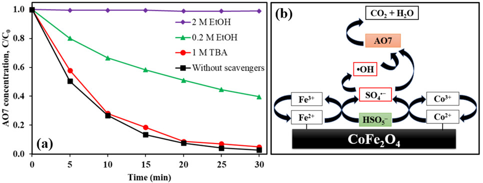 Figure 8.Figure 8. (a) Influence of different chemical scavengers on AO7 degradation in PMS/CoFe2O4 system (Conditions: pH = 7, [CoFe2O4] = 0.20 g L−1, [PMS] = 0.20 g L−1, [AO7] = 10 mg L−1) and (b) proposed mechanism for AO7 degradation in CoFe2O4/PMS system.