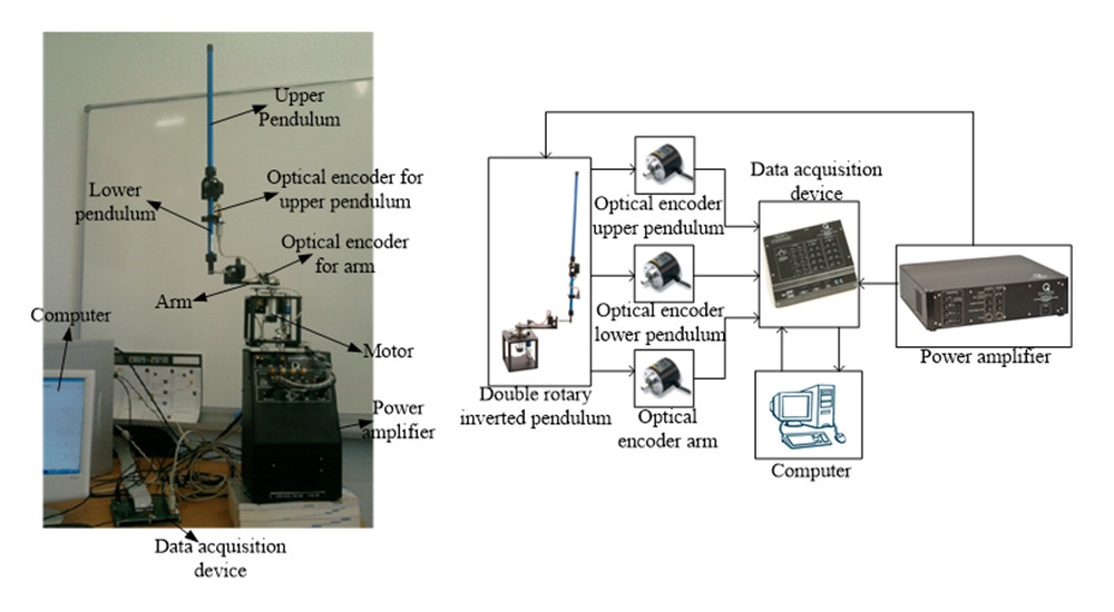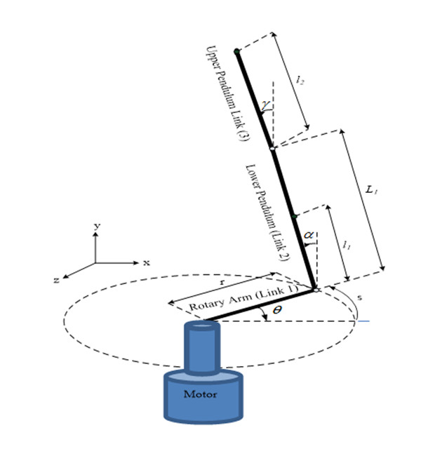 The Double Rotary inverted pendulum (DRIP) has double pendulums connected together and attached to a rotating arm as shown in Figure 1 (a). The plane of the two pendulums is orthogonal to the radial arm. The arm is actuated by a controlling torque with the objective of balancing the two pendulums in the inverted position. Therefore, it has three degree of freedom (DOF) [1]. The actuated joint angle can make some movement in order to stabilize the two pendulums [2]. The DRIP is a nonlinear, unstable, non-minimum phase, and under-actuated mechanical systems [3]. The schematic diagram of the experimental setup is shown in Figure 1 (b).