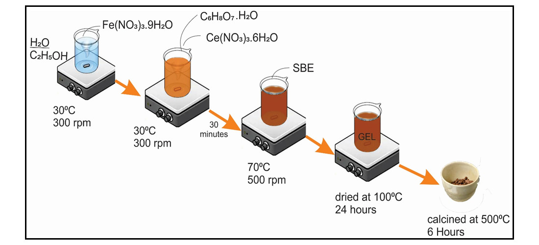 The preparation of the CeFeO3/SBEe perovskite catalyst was prepared using a modified method [18]. The reactant precursors of the compound are 2.20 g of Ce(NO3)3.6H2O (Sigma Aldrich), 2.02 g of Fe(NO3)3.9H2O (Merck), and 2.10 g of C6H8O7.H2O (Merck), while the solvent is 30 mL of mixed H2O/C2H5OH with the ratio of 1:2. Furthermore, the solution was stirred homogeneously at room temperature for 30 min. Subsequently, 2 g SBEe were added and stirred at 70oC until the gel was formed. Next, the gel dried at 100oC for 24 hours and calcined at 500oC for 6 h in air. Then the catalyst was put in storage in a desiccator while waiting for usage. The same procedure was also carried out for CeFeO3/SBEc.