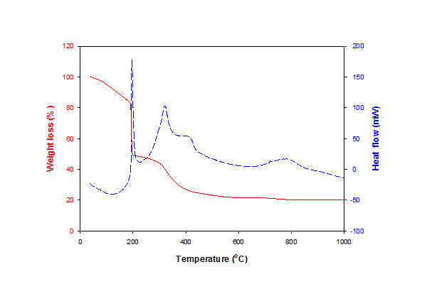 The Following, at around 250 oC to 500 oC, weight loss of about 21.5% relates to the loss of oxygen from precursor resulting in the phase transformed into perovskite structural compounds CeFeO3, as shown in the following reaction.