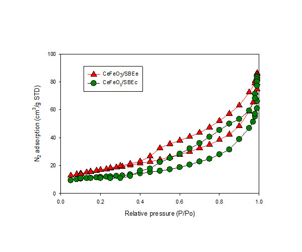 Figure 4.N2 adsorption isotherm of the perovskite catalyst CeFeO3/SBEe and CeFeO3/SBEc