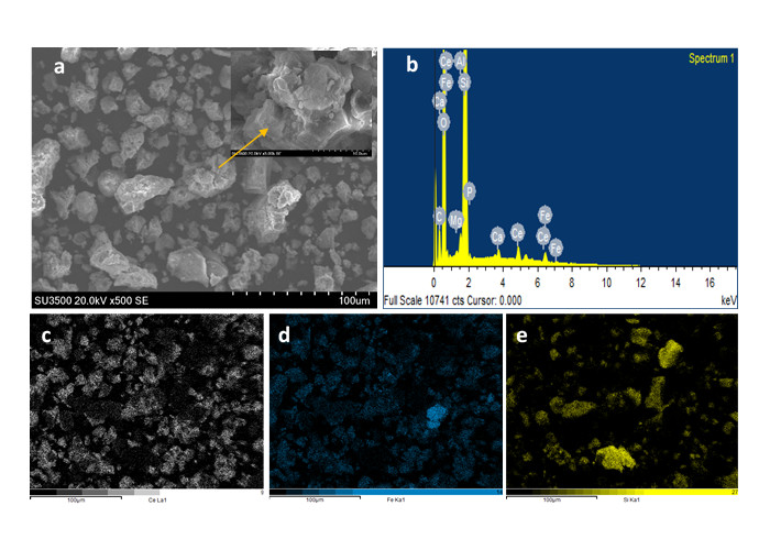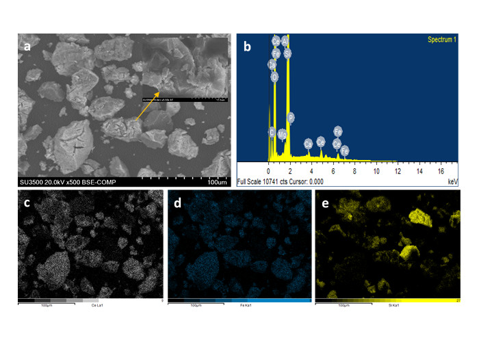 Figure 5 and Figure 6 present SEM images, EDS spectrum, and mapping images of supported CeFeO3 catalysts. Most CeFeO3/SBEe and CeFeO3/SBEc perovskite catalysts exhibited agglomeration of the particles, and asymmetrical shapes with the average size of CeFeO3/SBEe particles are 1-30 μm, while CeFeO3/SBEc are 10-70 μm (Figure 5 a and Figure 6 a). It was apparent that the diameter of CeFeO3/SBEe particles was less then CeFeO3/SBEc particles. The EDS spectrum of two catalysts is shown in Figure 5 b and Figure 6 b. Both samples showed the attendance of Ce, Fe, Si, Al, Ca, and Mg. Consequently, the EDS spectra implied the presence of Ce and Fe on two catalysts, conforming XRD patterns. The elemental mapping images of the particle is shown in Figure 5 c, d, e, and Figure 6 c, d, and e, and it indicates the presence of two elements such as Ce, Fe. Both elements are equally distributed.