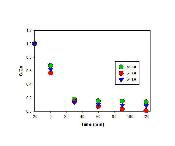 Owing to the high-activity of CeFeO3/SBEe, additional investigation on CeFeO3/SBEe was carried out to comprehend the effect of operational conditions. The stability and activity of the catalyst under acidic, neutral, and basic conditions, were investigated under various pH conditions. The effect of pH at 5, 7, and 9 on the photocatalytic degradation is presented in Figure 8. Overall, the pH of the Methylene Blue (MB) solution affects the photocatalytic degradation process due to the relationship between the stability of the catalyst nature and the pH solution [24]. At pH 5, MB was degraded 89.60% at 120 min, while at higher pH, which is 7.0 and 9.0, removal would be achieved at 99.5 and 94.45% in 120 min, respectively. Under acidic conditions, OH• radical ions produced by the catalysis process will react with H+ to produce H2O compounds, and reduce the efficiency of degradation. Under higher pH conditions, OH- ion might be more available to be converted to OH• radicals. Thus, it will increase the efficiency of MB decolorization. However, at high pH value, H2O2 produced from the water catalyzed process would be unstable and could be decomposed into H2O and O2 compounds, which cannot perform degradation activities [25-27]. This phenomenon can be seen at pH 9.0; there is a slight decrease in degradation activity compared at pH 7.0. Thus, the efficiency of BM removal toward the effect of pH followed the order of pH 7 > pH 9 > pH 5. The CeFeO3/SBEe perovskite catalyst has high activity at the pH range of 7-9. So, the catalyst that has been synthesized has good activity properties under various pH conditions [28].