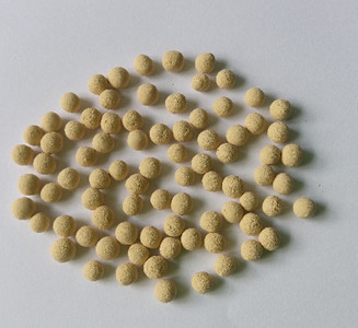 ZC was mixed with binder and homogenized. Then, deionized water with ratio dry mixture mass:volume = 1:1 was slowly poured into a cavity in the center of the container containing the dry mixture until a paste was obtained. After homogenization, the pasty mixture was molded into spherical granules. After the molding step, the material was dried in an oven at 100 °C for 2 h and calcined in a muffle at 500 °C for 2 h. The diameters of granules ranged between 3 mm and 6 mm. ZC content was maintained at 90 and 95 wt. %. Eleven pelletized zeolite samples (ZP1 to ZP11) with dextrin, calcium hydroxide, bentonite, kaolinite, and a mixture of the binders with different amounts are listed in Table 1 . Figure 1 illustrates one of the pellet samples produced.