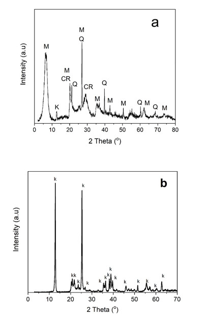 Figure 4.Figure 4. XRD diffractogram of (a) bentonite (M: montmorillonite, Q: quartz, k: kaolinite, CR: cristobalite); (b) kaolinite (k: kaolinite)