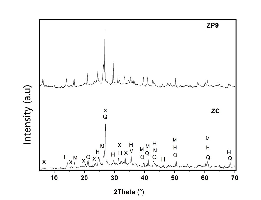 Figure 5.Figure 5. XRD diffractogram of power zeolite and granular zeolite (H = hydroxysodalite; X= NaX; Q = Quartz, M = mullite)