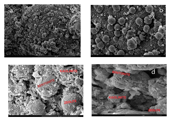 In the micrographs obtained from granular zeolite is observed that the zeolite particles are surrounded by the binders bentonite and kaolinite (Figure 6c and d).