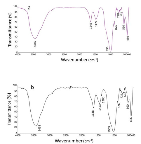 Figure 7.Figure 7. FTIR spectra of the as-synthesized zeolitic material (a) ZC powder; (b) ZP9 pelletized