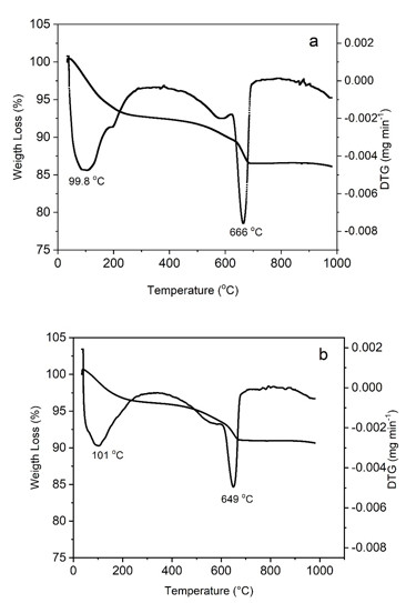 The profile of the thermogravimetric curves of ZC and ZP9 are shown in Figure 8. From Figure 8a, the great loss of mass weight associated with loss of free and physically adsorbed water inside the zeolite pores occurred between 33.8 oC and 49.0 oC (7.24%). It can be seen that sample showed continuous weight loss until 400 oC due dehydration, after that it became almost constant. In the second stage, the mass loss between 296.68 °C and 716.03 °C (6.26%) can be attributed to the decomposition of CaCO3 from fly ash used as raw material for the zeolite synthesis [49]. The profile of the thermogravimetric curves of the granular zeolite (Figure 8b) was maintained in relation to that obtained for the powdered zeolite, thus confirming the thermal stability of the material after the pelletization process.