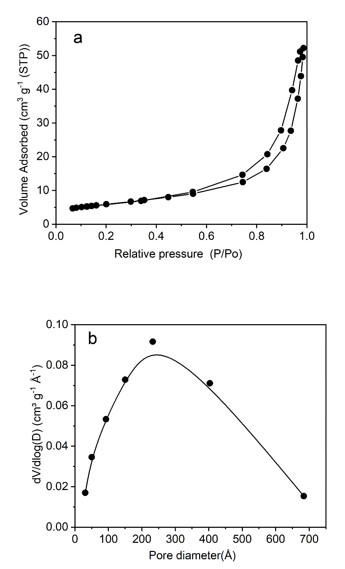 Figure 10.Figure 10. (a) Nitrogen adsorption-desorption isotherms; (b) Pore diameter distribution curve for ZP9